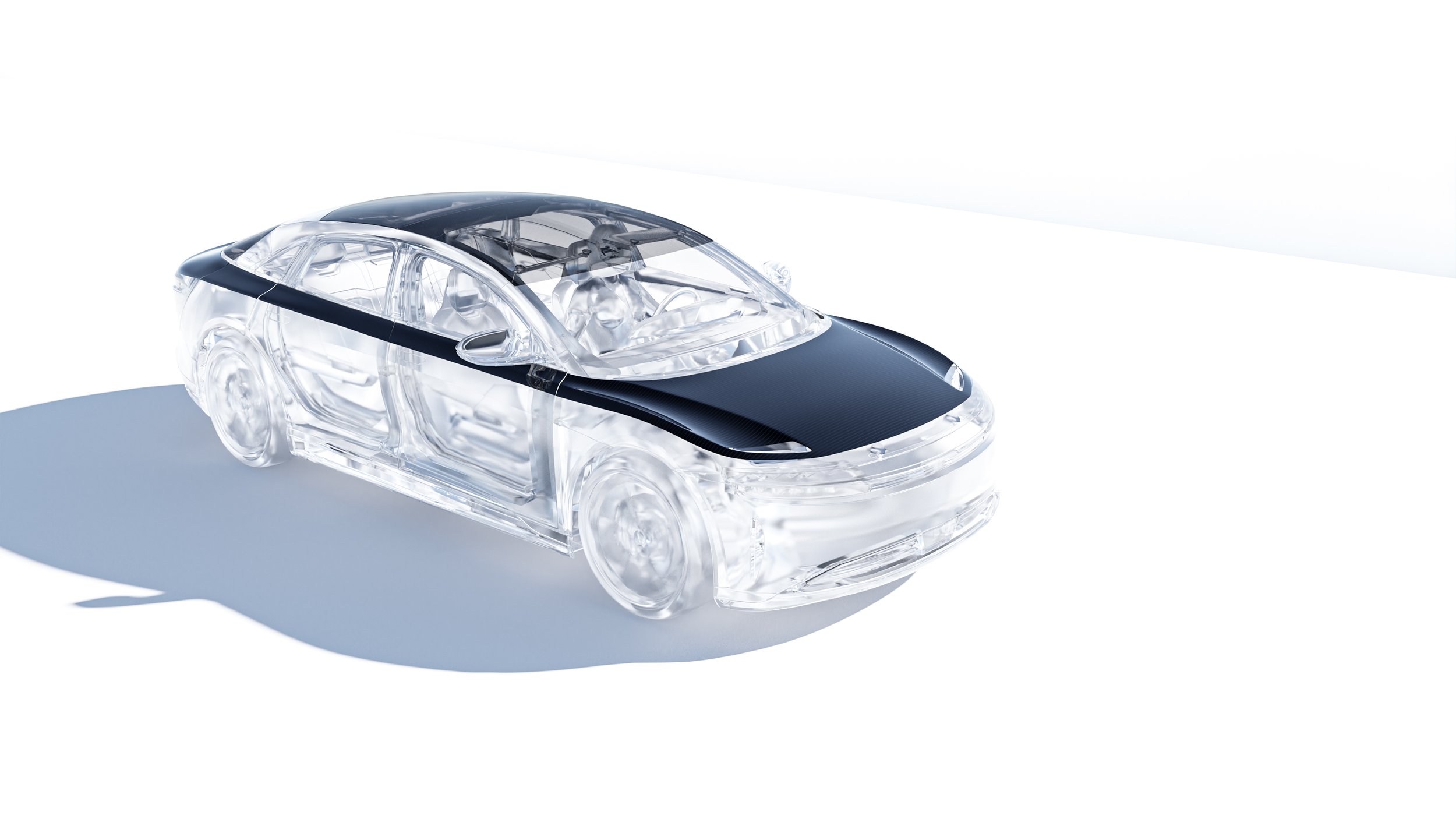 R&D Goal: Modify and model the Lucid Air to integrate the solar panels under the clearcoat layer on the top of the vehicle and add transparent panels too the moonroof glass.